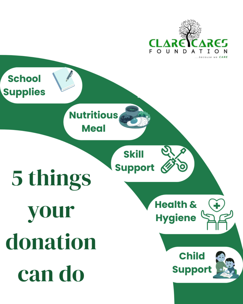 Kickstart your week by making a real and lasting difference in the lives of those who need it most. At Clare Cares Foundation, your support helps us to: Provide school supplies to children in underserved communities. Deliver nutritious meals that support healthy growth and learning. Support skill development for self-reliance and empowerment. Promote health and […]